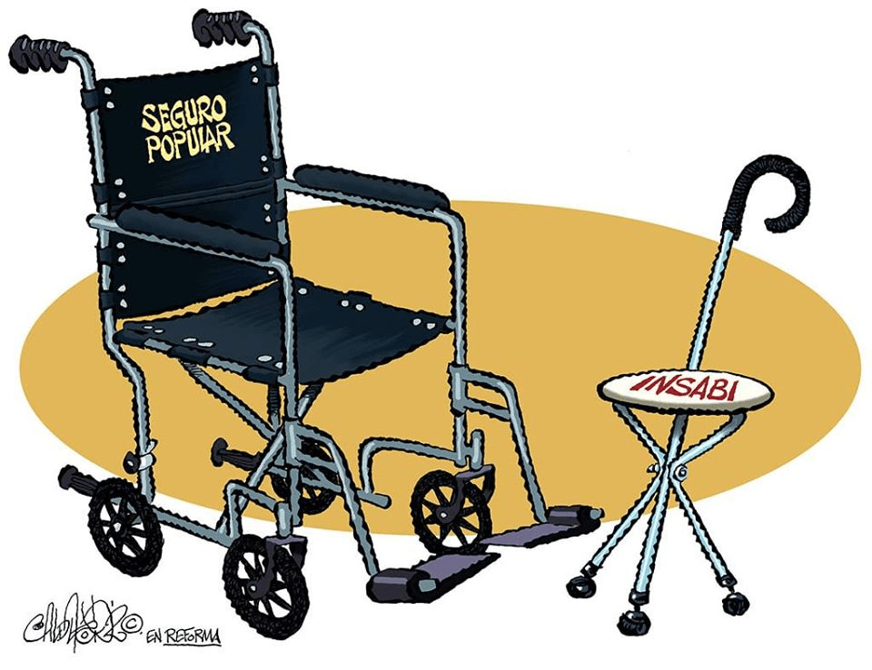 En este caricatura tenemos una silla de ruedas con la escritura seguro popular y un caminador con la escritura Insabi.