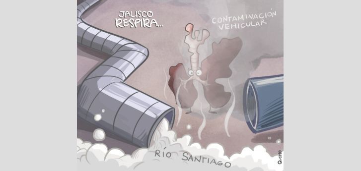 Podemos leer las frases “Jalisco respira”, “contaminación vehicular” y “Río Santiago”, estas frases demuestran los efectos de la cuantidad de polución que hay en Jalisco y que hace que la gente tiene enferma.