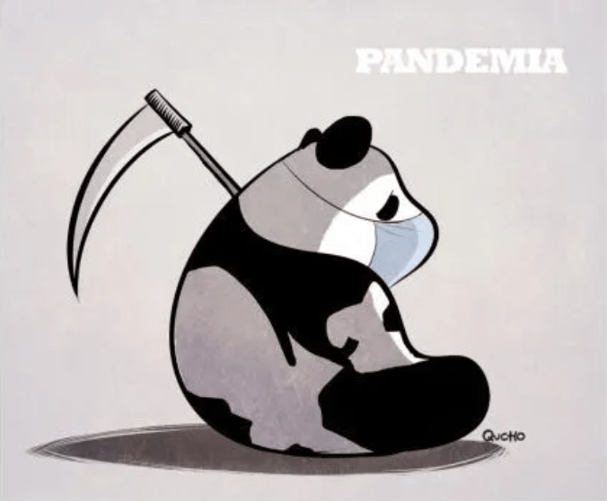 Esta caricatura se titula “ Pandemia” y se publico el 25 de febrero 2020 en la pagina web informador.mx. El en dibujo, podemos ver a un panda con una mascarilla. Su cuerpo parece como un globo y tiene una guadaña, el panda parece muy triste también. Las colores del dibujo traducen un sentimiento muy triste también y eso transmite el sentimiento general de la población sobre esta pandemia.